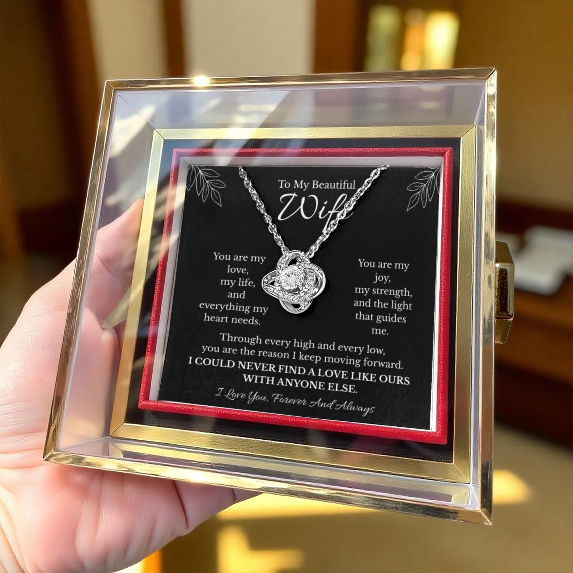 Give your wife a breathtaking reminder of just how much she means to you. This elegant Love Knot Necklace represents the unbreakable bond between two souls, a symbol of everlasting love, devotion, and the life you’ve built together.